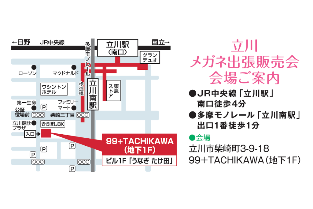 立川メガネ販売会のお知らせ(2026年3月) HOME お知らせ 立川メガネ販売会のお知らせ(2026年3月) 立川メガネ出張販売会を下記日程にて開催いたします。 2026年 3月 13日(金) 11:30 ~ 18:00 2026年 3月 14日(土) 10:00 ~ 18:00 2026年 3月 15日(日) 10:00 ~ 15:00 ●開催日当日のご連絡先 080-1256-9015 ご来場の際は必ず事前のご予約をお願いいたします ご予約の際は、出張販売会ご希望の旨をお申し付けください。 ホームページからご予約の場合は、ご来店目的の詳細にご記入をお願いいたします。 皆様のご来場を心よりお待ちしております 来店予約 来店予約をされる場合は以下から詳細をご確認ください。 来店予約について